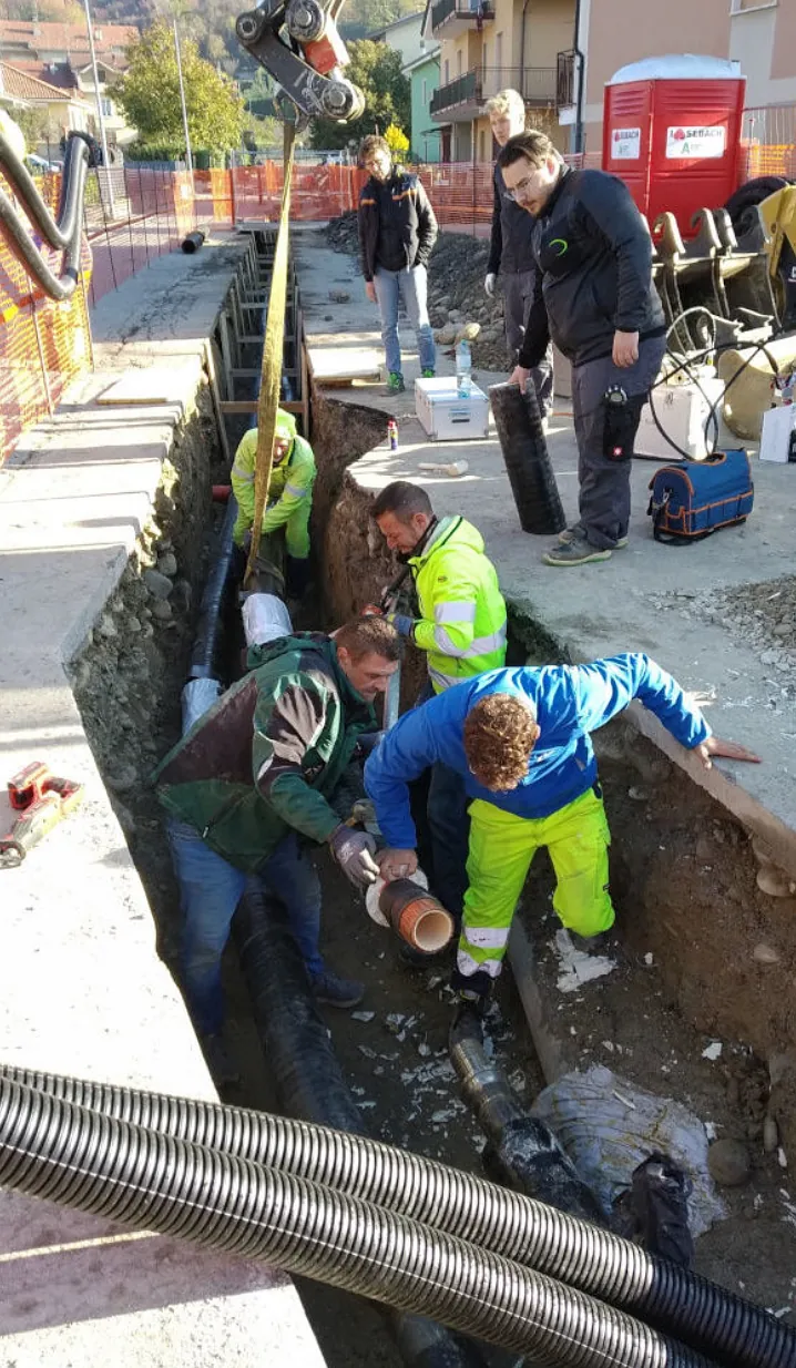 This configuration results in clear technical advantages. The flexibility of FibreFlex allows it to be coiled and delivered in lengths of up to several hundred meters, eliminating the need for numerous joints and welds. Where steel requires welding pits every six to twelve meters, FibreFlex can be unrolled continuously into the trench and connected only at necessary junction points, reducing both labor and the risk of leakage. Since the material does not require expansion loops or oversized bends, excavation trenches can remain narrow and shallow. Studies and field experience have demonstrated that excavation volumes are reduced by up to forty percent compared to steel-based systems. The Dogliani project itself illustrates this efficiency: during the first day of installation, eighty meters of FibreFlex network were laid, connected, and backfilled in a single morning, minimizing disruption and allowing the road above to be reopened almost immediately.